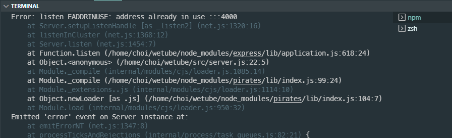 Node.JS 실행 중에 다음과 같은 에러가 발생했는데, 이미 4000포트를 사용하고 있어서 발생하는 것 같다.
