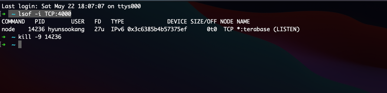 다음과 같이 4000번 포트를 점유중인 번호인 14236를 확인할 수 있고 강제종료 시그널 -9를 활용하여