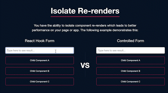 + 아, 추가적으로 react-hook-form 없이 useState와 onChange 이벤트를 사용해서 구현하면 자식 컴포넌트가 입력값이 바뀔때마다 계속해서 리렌더링 되는 상황이 일어날 수 있는데, react-hook-form은 그런 리렌더링으로부터 독립적으로 Form을 관리해주어 성능상의 이점도 가져갈 수 있다! 또한, 공식문서에 있는 Subscriptions 부분을 보면 Form의 성능은 UX 측면에서 굉장히 중요하다고 말하고 있고, react-hook-form을 이용하면 전체 컴포넌트를 리렌더링 하지 않고도 개별 입력 값 및 상태를 업데이트 할 수 있다고 한다.
