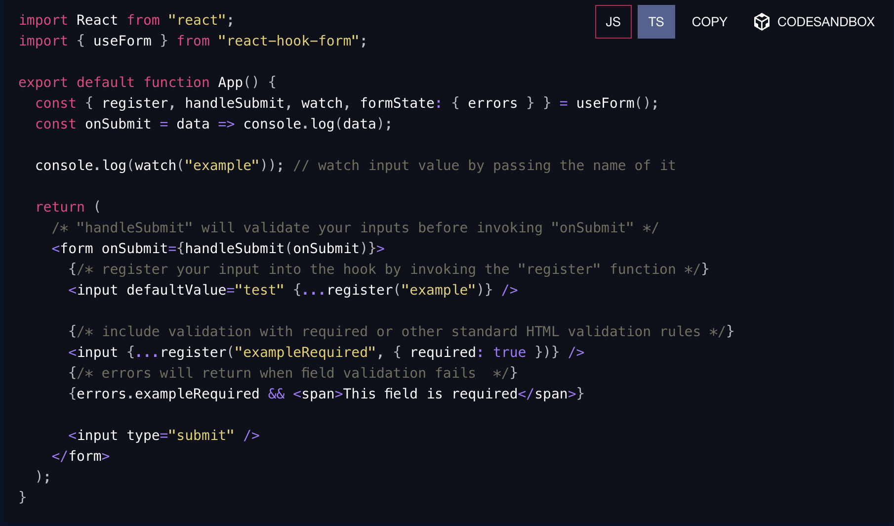 react-hook-form 공식문서의 예제를 먼저 살펴보면, react-hook-form 패키지로부터 useForm() 이라는 Hook 함수를 불러온 후, 결과 객체로부터 register, handleSubmit, ... 등의 함수를 얻을 수 있다.
