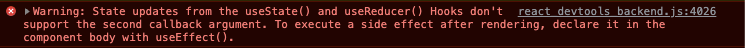 에러 메세지를 읽어보면 useState와 useReducer hook은 2번 째 인자에 콜백 함수를 지원하지 않고, 대신 렌더링 이후 사이드 이펙트를 만들기 위해서는 useEffect 함수를 사용하라고 한다. 알고 보니까, setState 함수에 2번 째 인자를 넘기는건 Class Component에서만 가능하다고 한다 ^^..