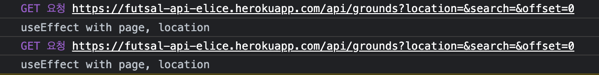 새로고침을 할 때, 윗 부분에 처음 페이지를 구성할 때 useEffect 함수를 사용하는 부분이 있어서 총 2개의 useEffect 함수가 실행되는 것이다. location을 deps로 가지고 있는데 실행이 되는 이유는 (아마) 컴포넌트가 리렌더링 되면서 전체 state가 초기화 되면서 선언되기 때문에 변경을 감지하여 useEffect 함수 2개가 모두 실행되는 것 같다.