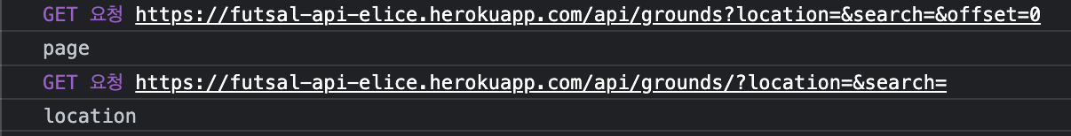 결과는 당연히 잘 작동하지 않을거라고 생각했다. 왜냐면 이전에 setState 함수가 비동기적으로 처리되기 때문이다. 그래서 변경된 location이 요청할 url에 제대로 들어가지 않았고 location이 기본 값대로 비어있는 채로 요청을 보내 생각과 다른 결과를 가져왔다.
